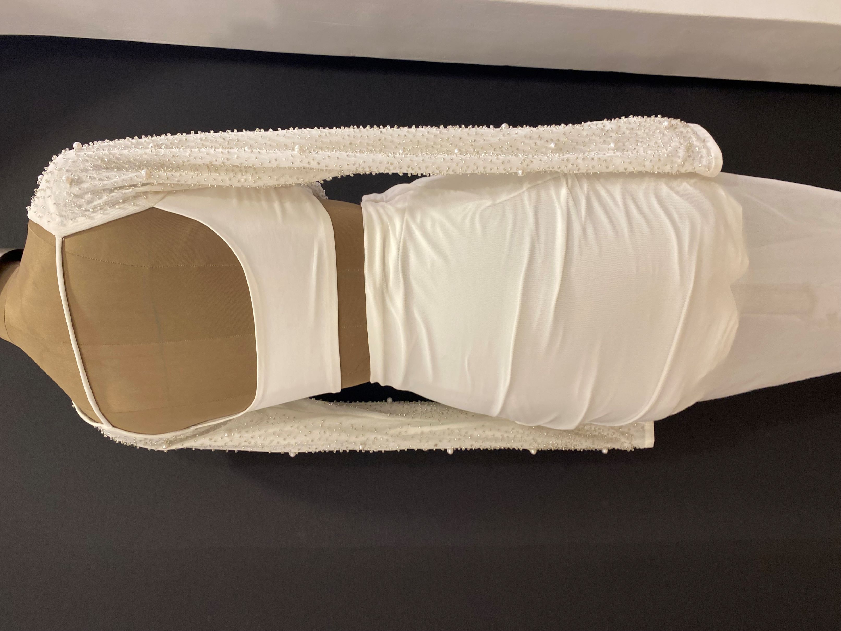 Fully embellished, dual lined mesh fabric. Bust-flattering cowl neckline. • back strap • Single layer mesh long, flare sleeves • Hidden zipper to the side • Cowl neckline